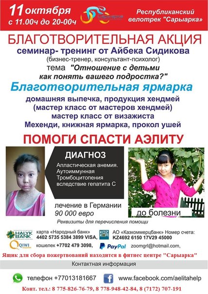 11 октября с 11:00 по 20:00 часов на велотреке "Сарыарка" прошла БЛАГОТВОРИТЕЛЬНАЯ ЯРМАРКА. На ярмарке были предоставлены продукции хендмей (мастер-класс от мастеров хэндмей), прошел мастер-класс от визажиста Мехенди, книжная ярмарка, а также семинар-тренинг от бизнес-тренера, консультанта-психолога Айбека Сидикова на тему "Отношение с детьми как понять вашего подростка?"